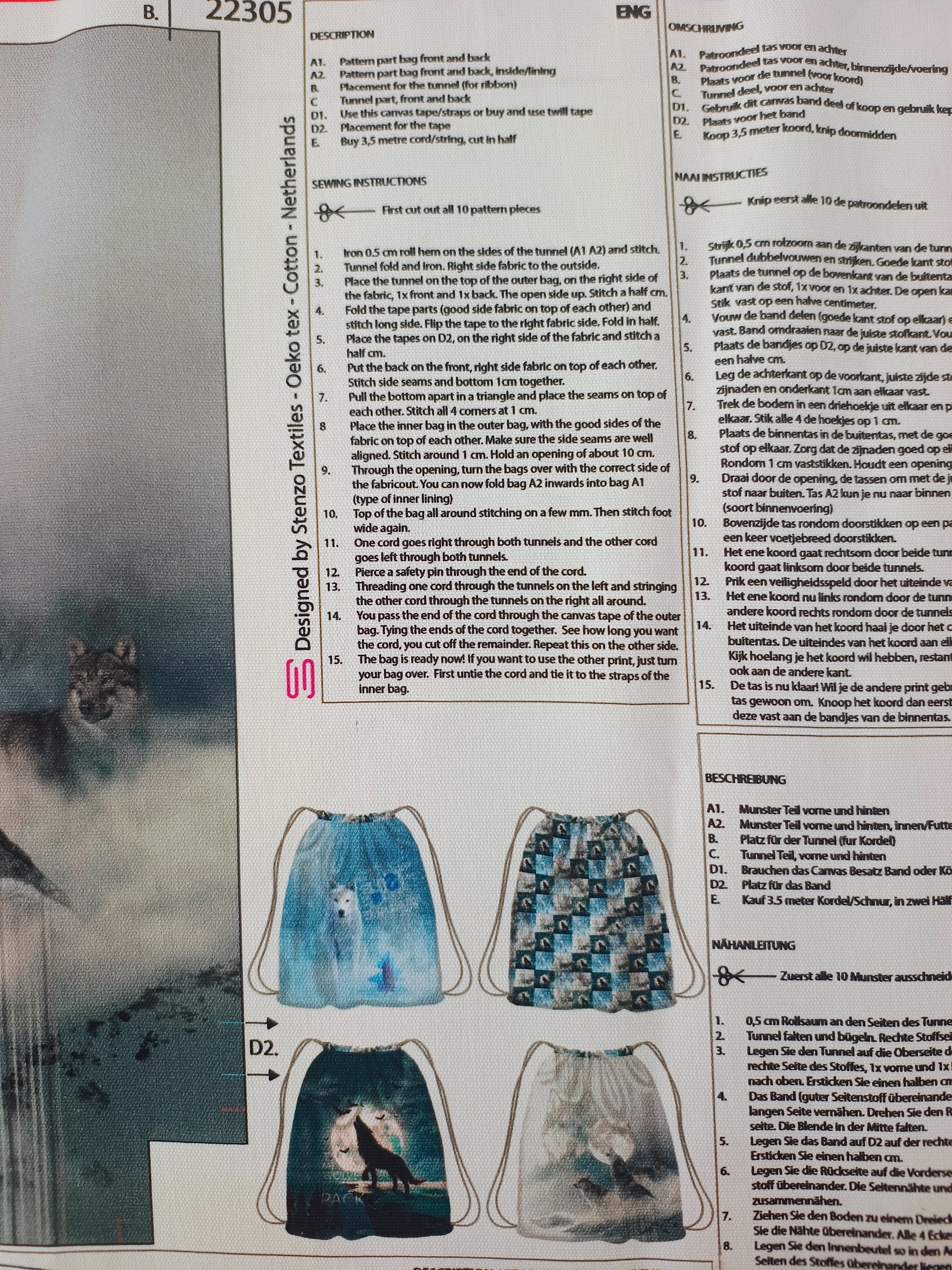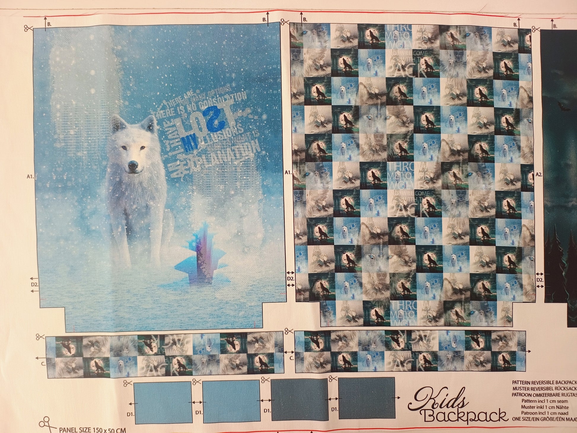 This panel includes instructions and fabric to make 1 reversible child backpack